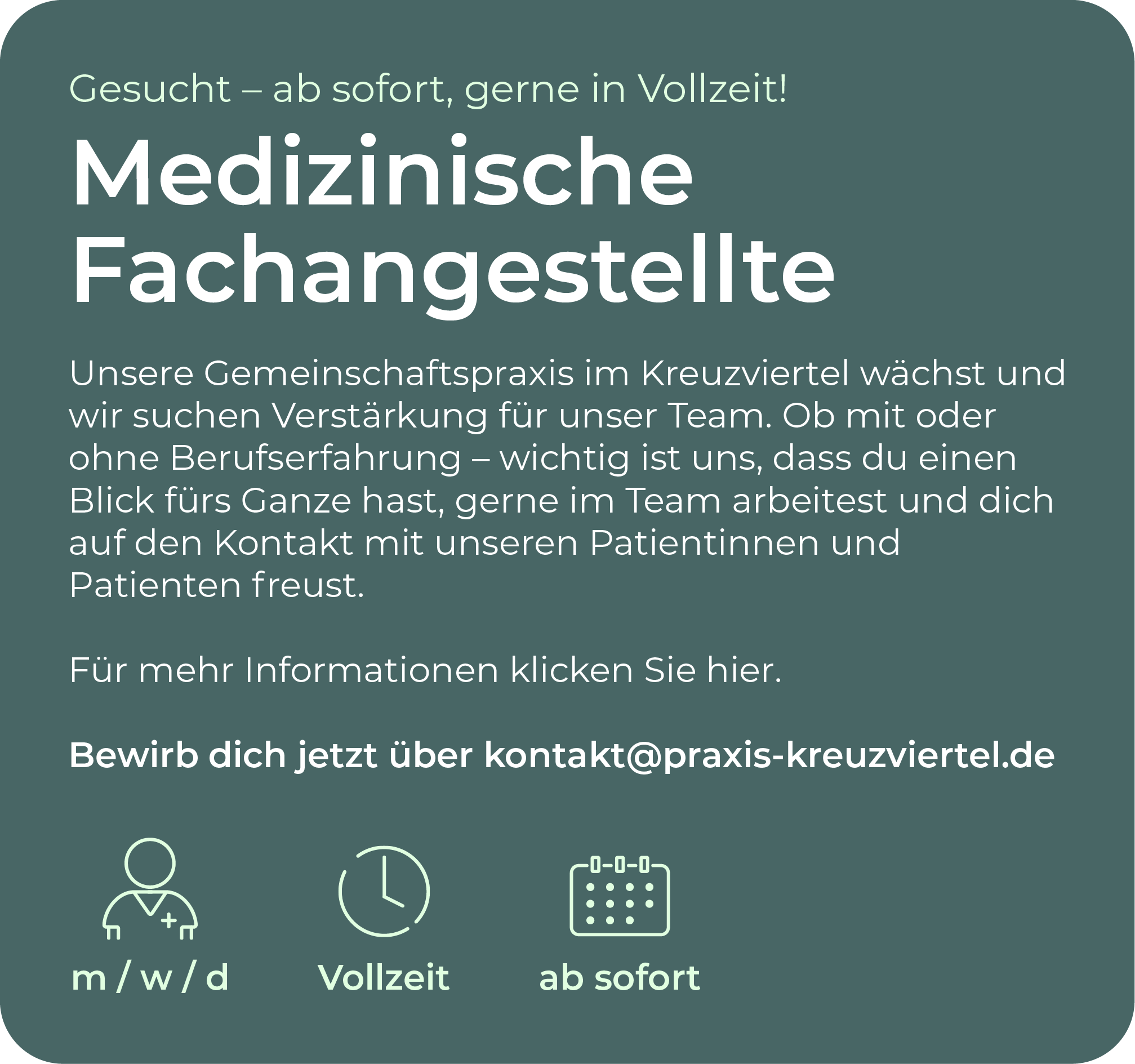 Wir sind immer auf der Suche nach Verstärkung für unser Team. Schick uns doch gerne deine Bewerbung für die gewünschte Position an kontakt@praxis-kreuzviertel.de