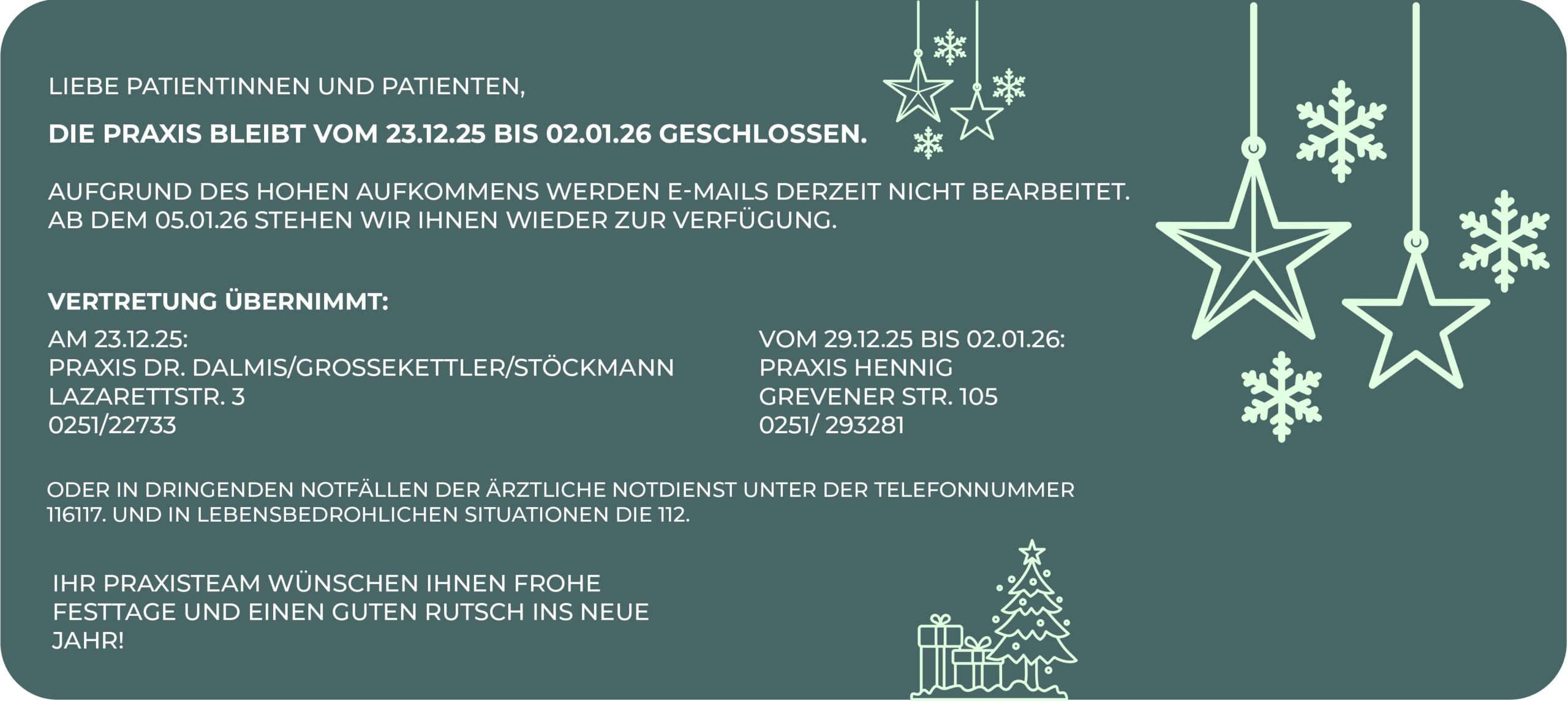 Wir sind für Sie da: Als Praxis für Allgemeinmedizin, Sportmedizin und Naturheilverfahren stehen wir Ihnen bei Ihren gesundheitlichen Anliegen mit Rat und Tat zur Seite. Nutzen Sie jetzt einfach unser Kontaktformular oder rufen Sie während der Öffnungszeiten an, um einen Termin zu vereinbaren. Wir freuen uns auf Sie!