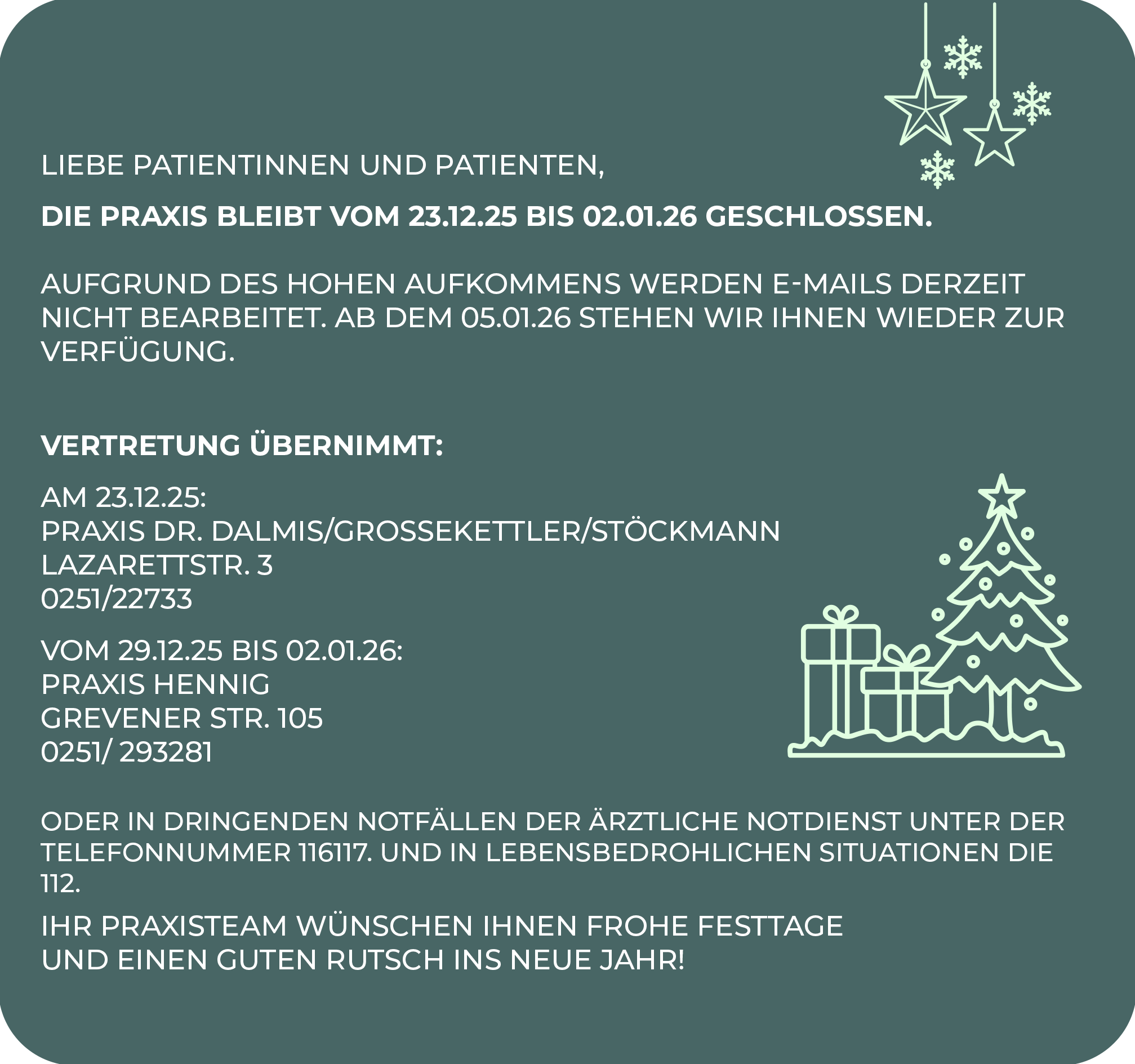 Unsere modern ausgestattete Praxis liegt zentral und ist bequem erreichbar. Während unserer Sprechzeiten kümmern wir uns mit größtem Engagement um unsere Patient:innen und setzen uns täglich für ihre Gesundheit und ihr Wohlbefinden ein.